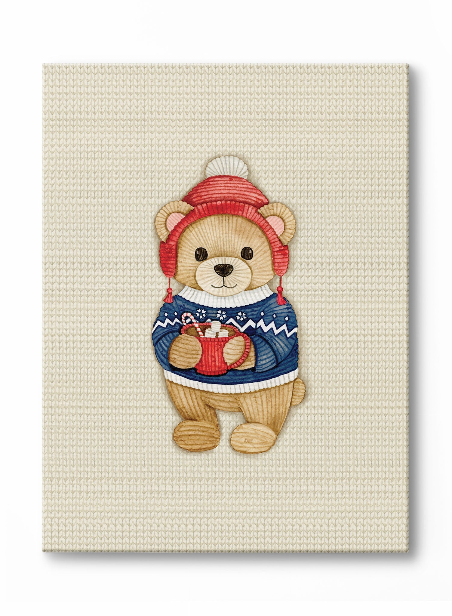 Wrap your space in the warmth of winter with this adorable print featuring a cozy bear, bundled up in a festive sweater and holding a steaming mug of hot cocoa. The soft, knitted texture of the background adds to the warmth of the scene, making the bear feel right at home in a snug winter setting. The playful details, from the bear’s bright red hat to the candy cane poking out of the mug, bring a touch of joy and comfort that will make you smile every time you see it.