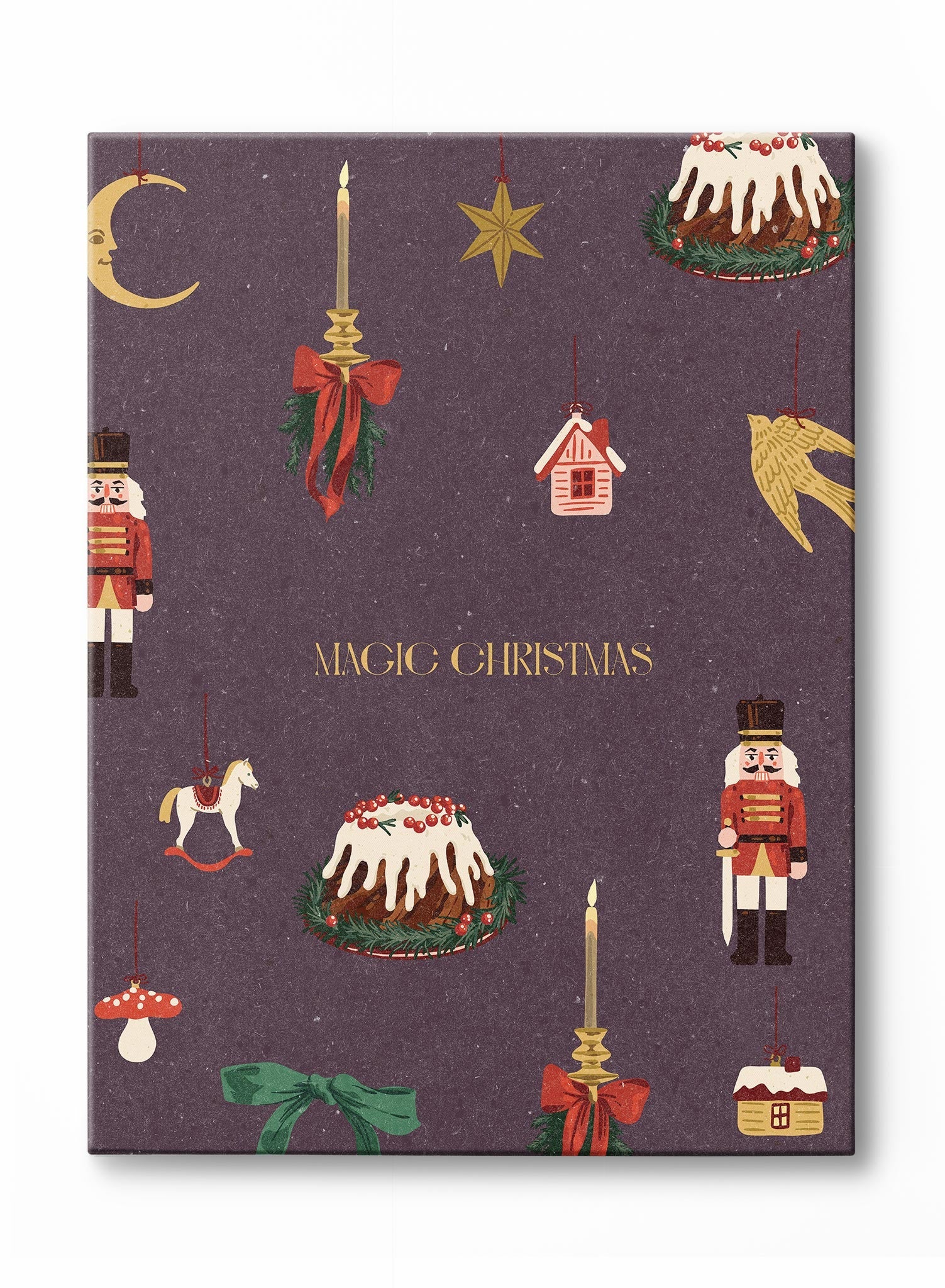 Step into a timeless holiday scene with this print featuring a collection of vintage-inspired ornaments set against a rich purple background. Nutcrackers, candles, and delicate Christmas puddings float gracefully in the design, each ornament crafted with intricate attention to detail.