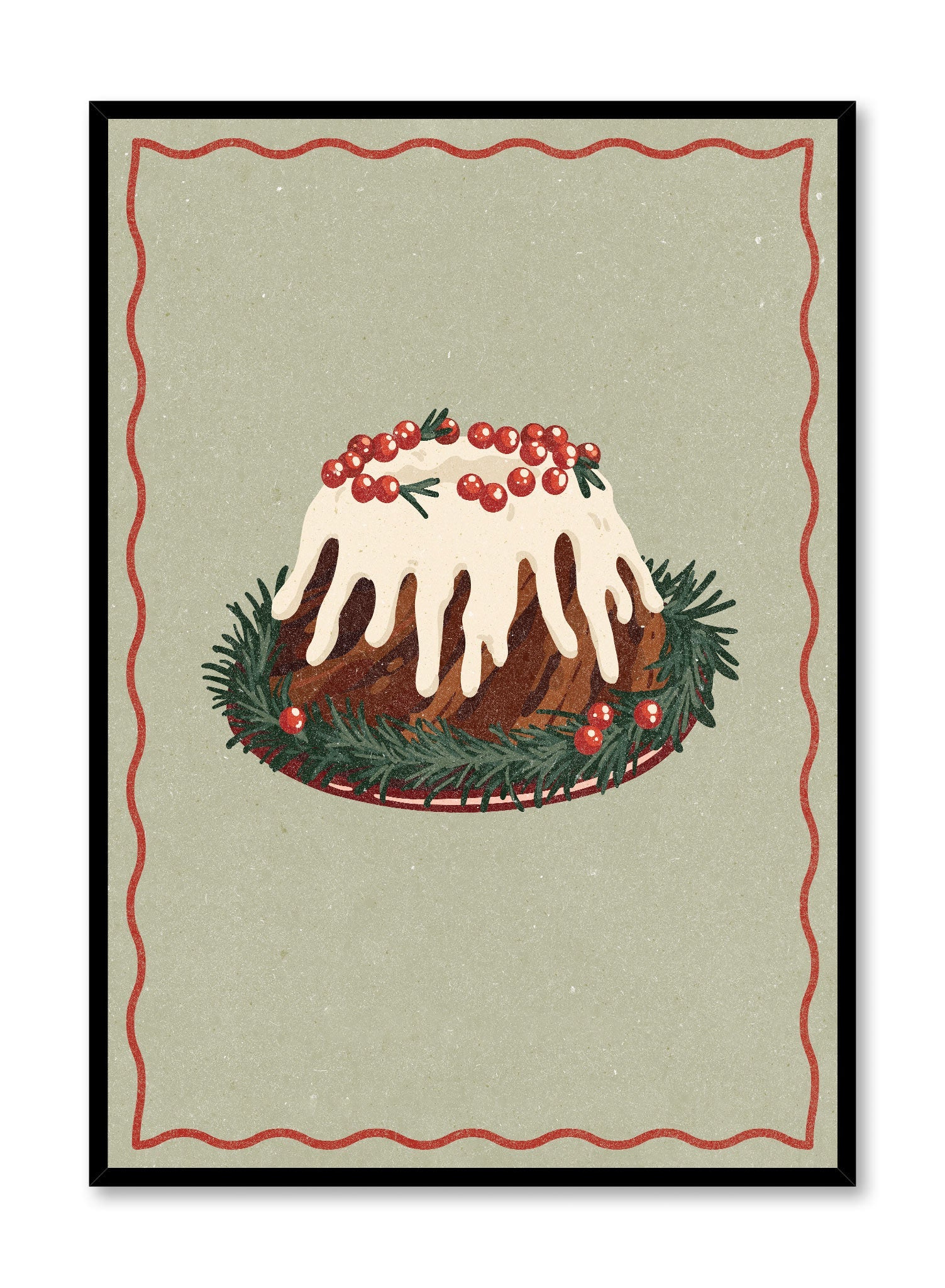 This print features a beautifully illustrated Christmas pudding, topped with rich white icing and accented by bright red berries and holly sprigs. Set against a muted green background with a simple red border, the piece offers a vintage feel reminiscent of traditional holiday illustrations.