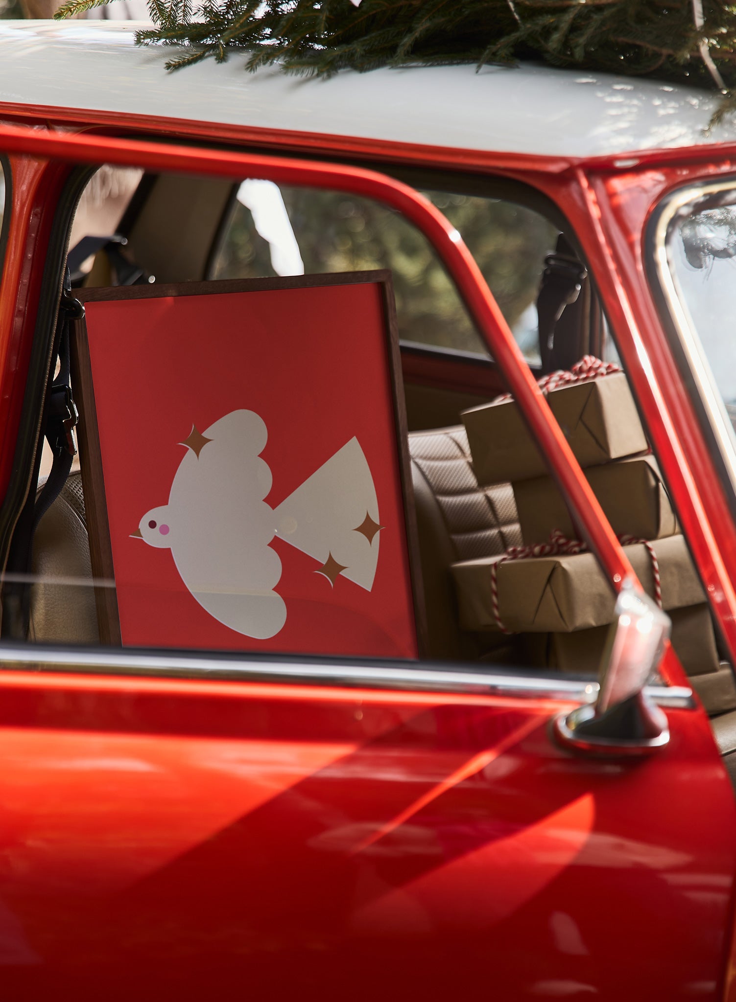 This minimalist artwork features a cream-colored dove set against a bright red background. The simple, clean lines of the dove’s body are accented with small golden stars, adding a festive touch. The bold contrast between the dove and the background creates a striking visual impact, while the softness of the bird’s form brings a sense of peace and calm.