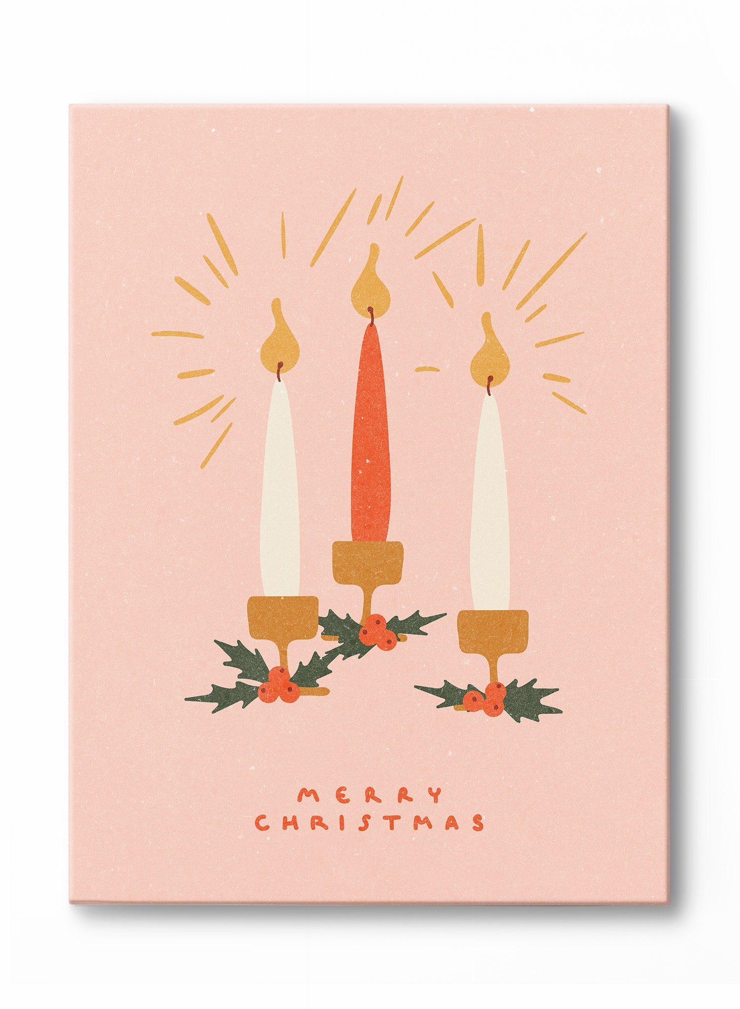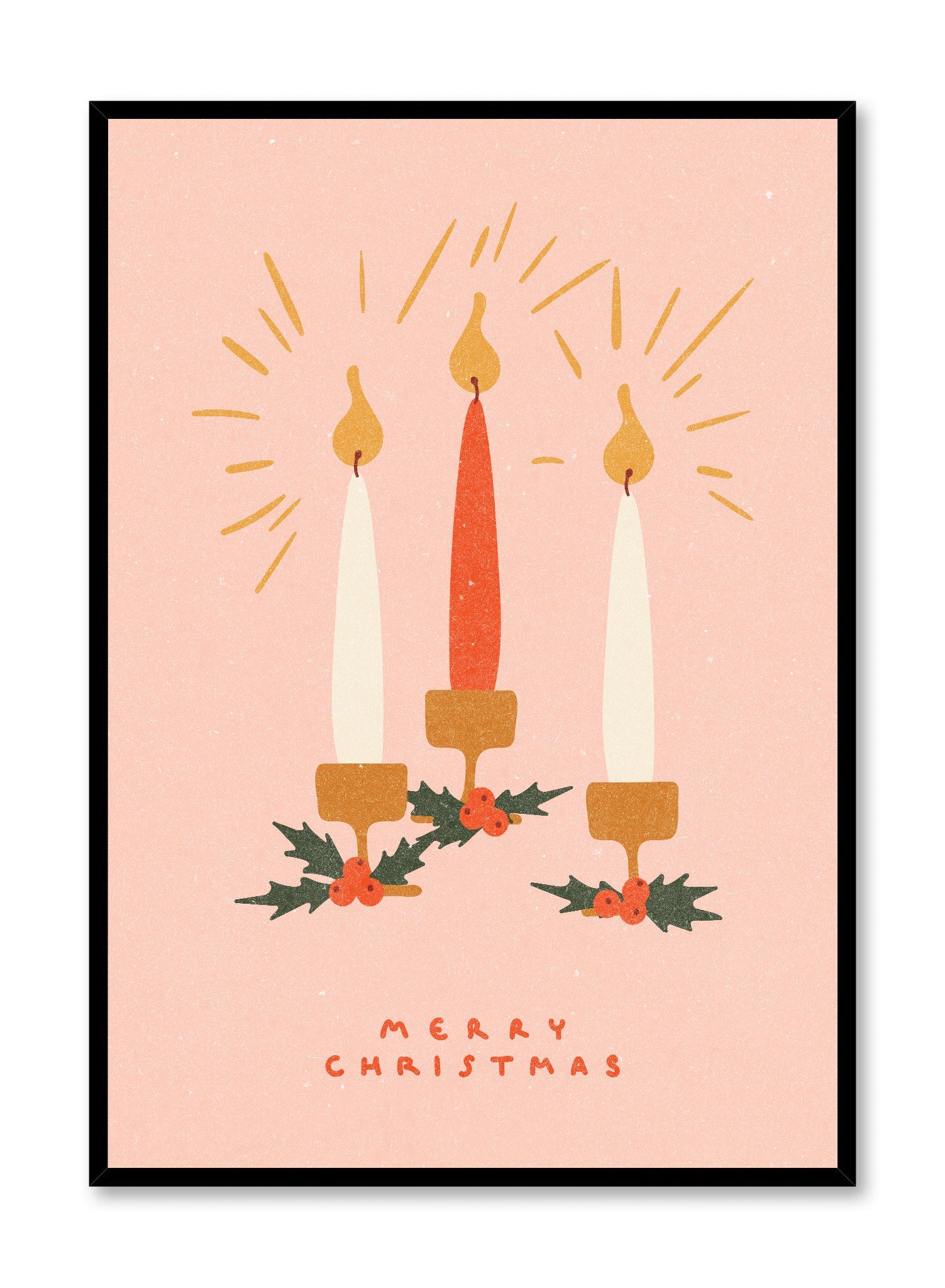 This festive print features three lit candles standing side by side, each set in a simple, golden holder adorned with sprigs of holly and red berries. The candle in the center is a vibrant red, flanked by two ivory candles. Radiating lines around the flames evoke warmth and light, creating a cozy glow against the soft pink background. Below the candles, 'Merry Christmas' is handwritten in red, adding a personal, cheerful touch.