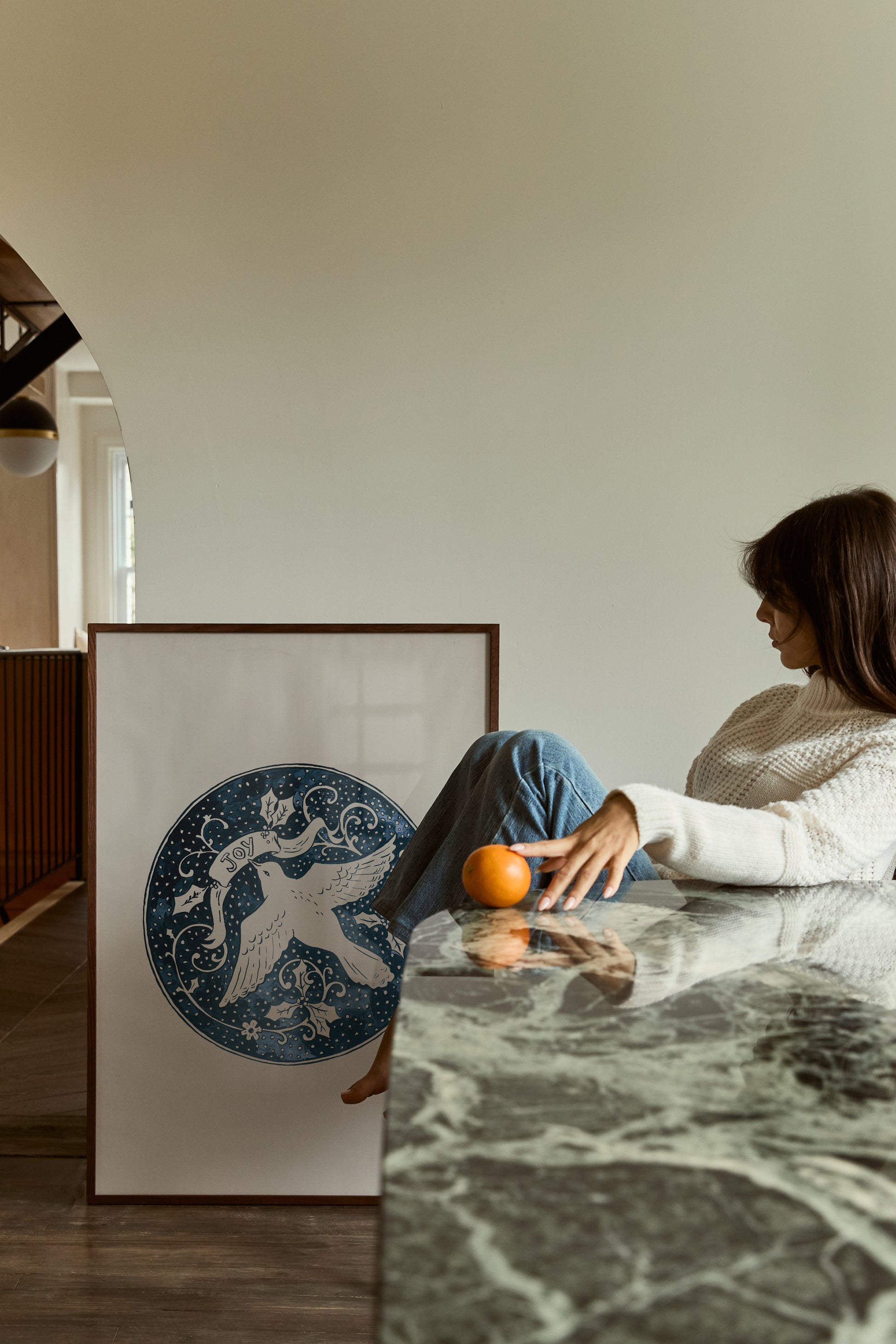 This graceful artwork features a white dove carrying a banner with the word “Joy.” The bird is set against a deep blue circular background filled with swirling vines and holly leaves. Snowflakes fall gently within the scene, adding a sense of winter tranquility to the composition.
