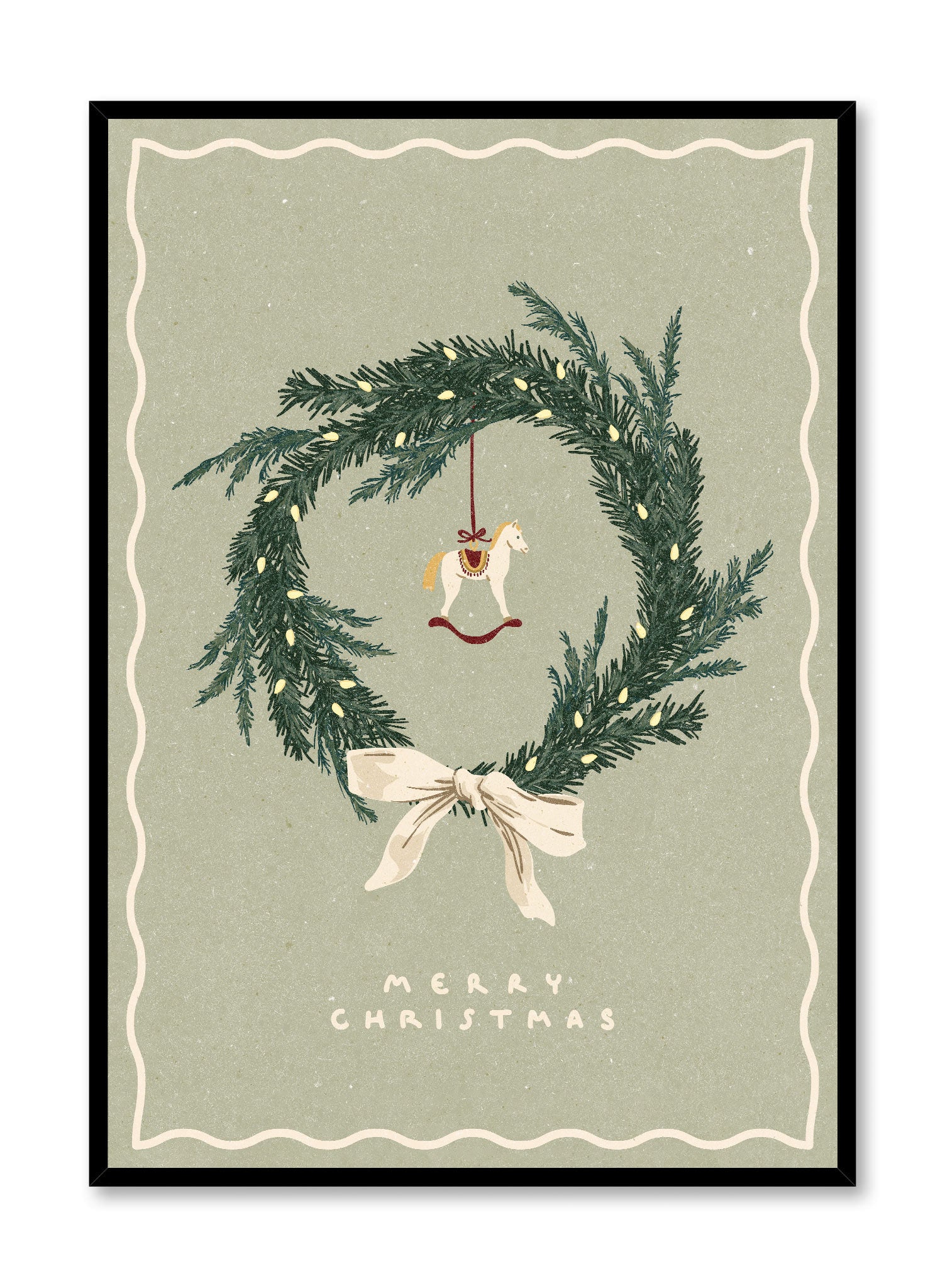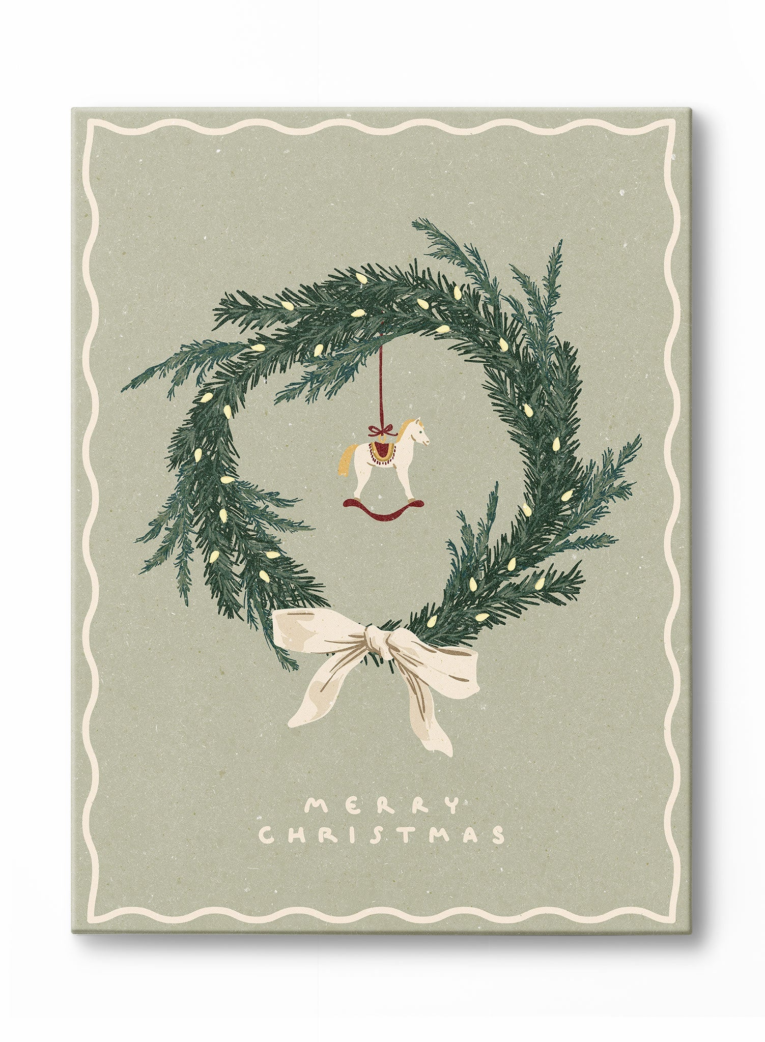A traditional pine wreath takes center stage in this holiday print, detailed with twinkling lights and a small rocking horse ornament. Tied together with a soft white ribbon, the wreath stands against a muted green background, creating a refined holiday aesthetic.