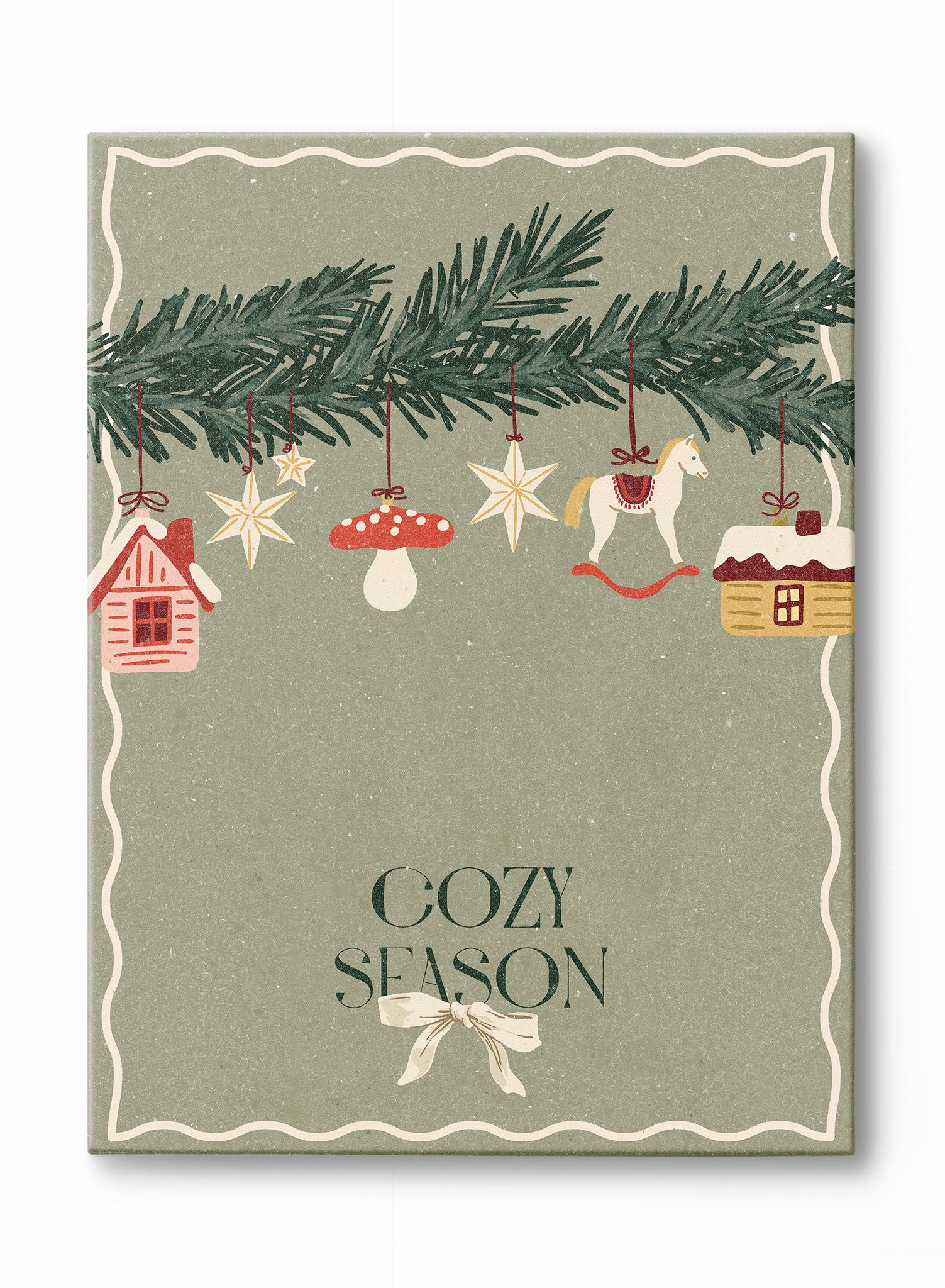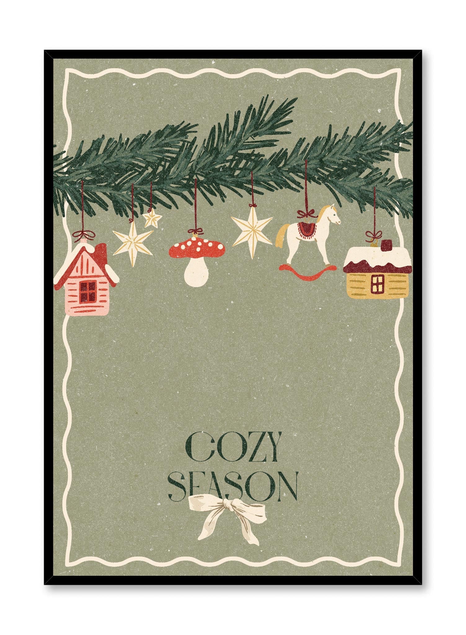 This cozy holiday print features a garland of pine branches adorned with charming ornaments like stars, mushrooms, and rocking horses. The muted green background adds a calming tone, while the hanging ornaments bring a playful touch to the scene. The “Cozy Season” message at the bottom is framed with a delicate ribbon, enhancing the print’s nostalgic holiday feel.