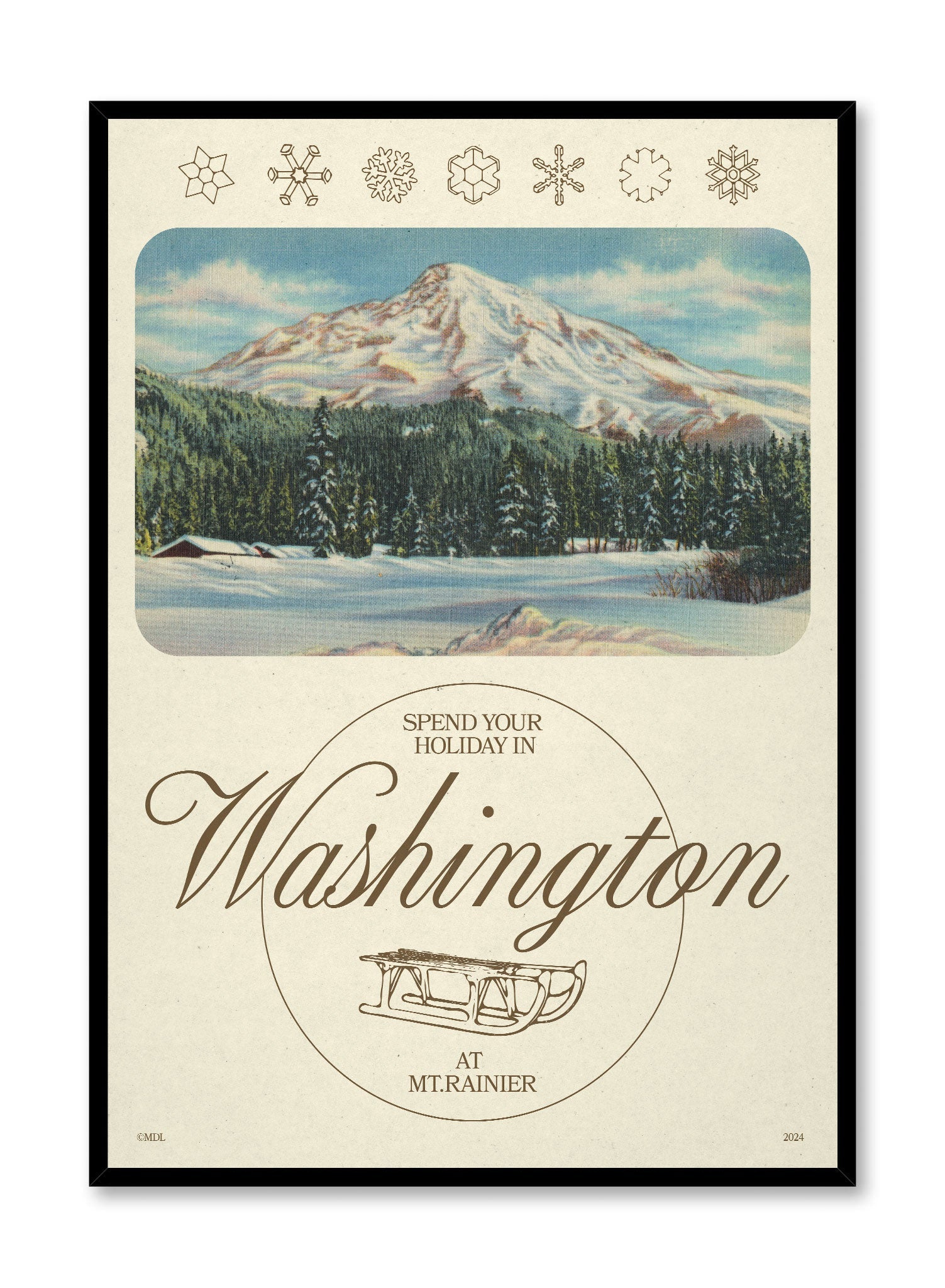 This vintage-style travel poster brings to life the serene beauty of Mt. Rainier. The snow-covered mountain dominates the background, standing proudly among towering evergreen trees. Below the mountains, a snowy cabin nestles into the landscape, while stylized snowflakes line the top of the composition, lending a decorative element.